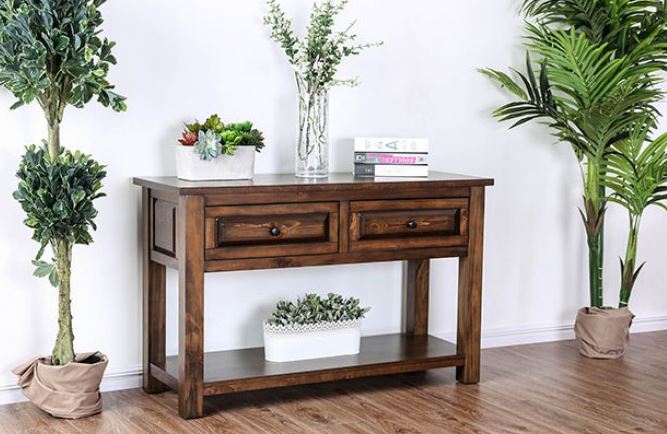 This table showcases an elegant wood grain and walnut finish. The drawer faces have a carved trim, simple pulls, and deep spacious storage. Low to the floor and built with sturdy block legs. This table will deliver charming wooden tone to your home for years.Read More