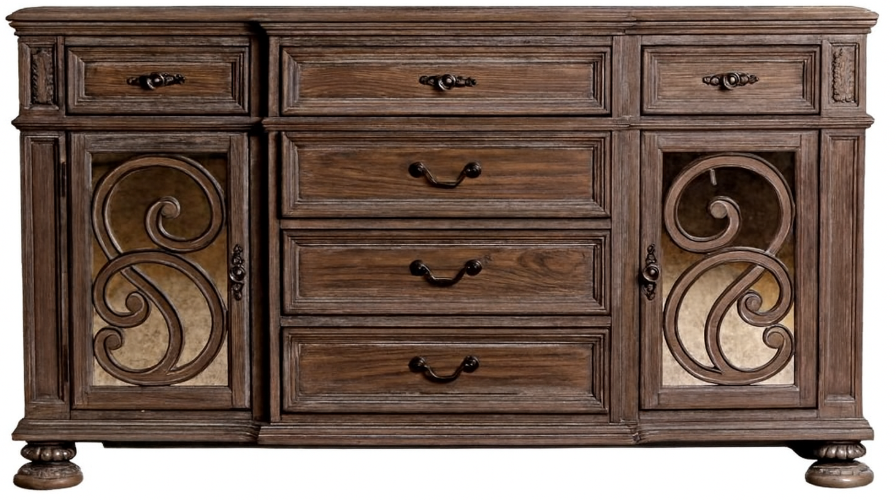 Beautiful wood inlay details create a grand statement with elegance galore. The mirror panels provide a stunning contrast against the rustic natural tone finish for a look that is as intricate as it is chic.Read More