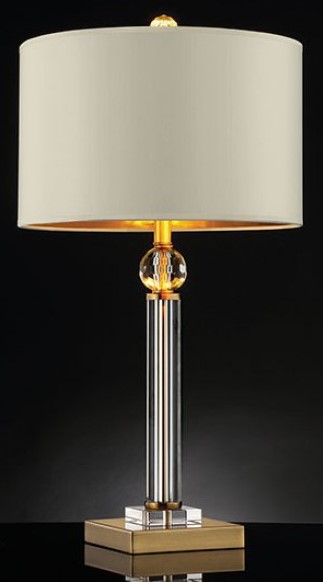 A petite and mysterious faux crystal sphere provides the balance of this magnificently crafted mixed-materials table lamp. The square base supports an elegantly designed stem that hosts the classic ivory shade with a shimmering gold interior lining.