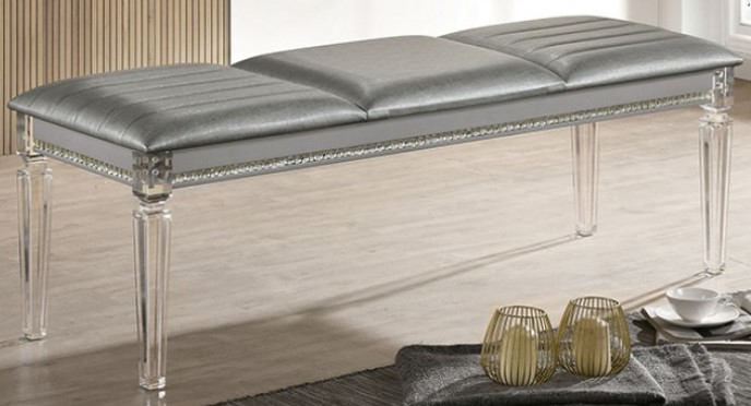 Create a room with this bench from the Maddie Collection. The cushion is padded and upholstered in a horizontally-tufted fabric, emphasizing the silver finish. The acrylic legs and crystal accents bring a glamorous aesthetic. Give into your glitzy side with this opulent bench.Read More