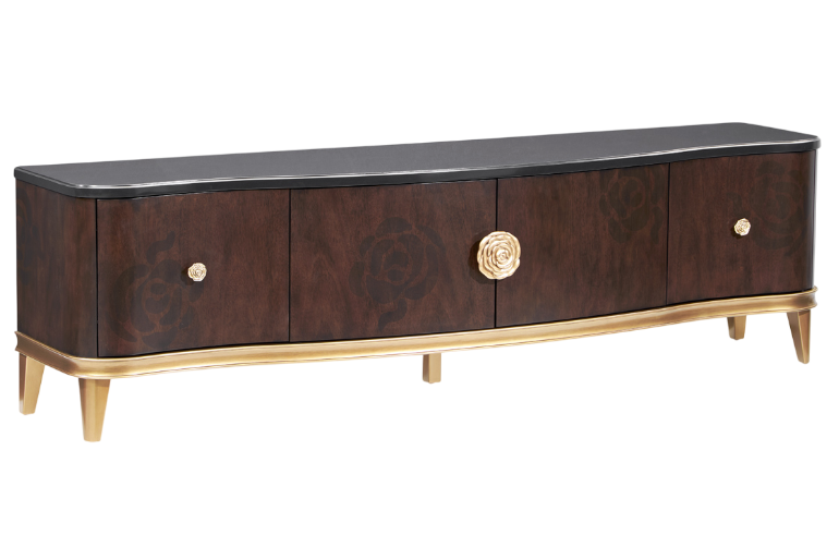 The Camellia Field warm pecan media cabinet, features warm pecan finish and camellia marquetry on the doors are complemented by antique gold accents, the signature camellia flower knobs, and a luxurious black marble top. This piece offers adjustable shelves, discreet wire management, and ample storage for all your media needs.Read More