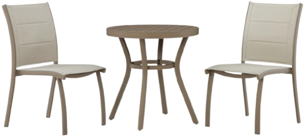 Craft a chic outdoor seating area with this table and chairs set. Outfitted in contemporary neutral hues, it's an ideal spot for sipping drinks poolside or relaxing on the porch. Sturdy aluminum construction and sling seating round out the set with both durability and comfort.Read More